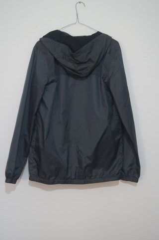 Casaco corta-vento para criança, tamanho S, equivalente a 16 anos. Ideal para proteger do vento. - Cor cinza escuro com detalhes em preto. - Forro interior preto. - Capuz integrado. - Bolsos laterais com fecho.