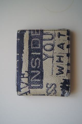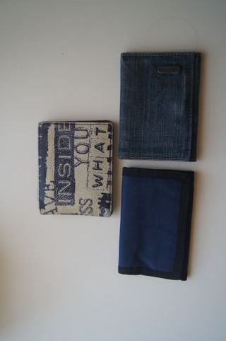 Conjunto de três carteiras para rapaz. - Uma carteira em ganga com um pequeno detalhe de marca. - Uma carteira com um padrão de texto em azul e bege. - Uma carteira azul simples com acabamento em preto.