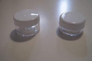 Saco de viagem com vários frascos transparentes e potes brancos. - Saco com padrão de bolinhas cinzentas e detalhes vermelhos. - Inclui 3 frascos transparentes com tampas brancas. - Inclui 2 potes brancos com tampa.