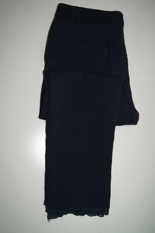 Calças azuis clássicas com um toque de renda na barra. - Tamanho 38. - Detalhe de renda na bainha.