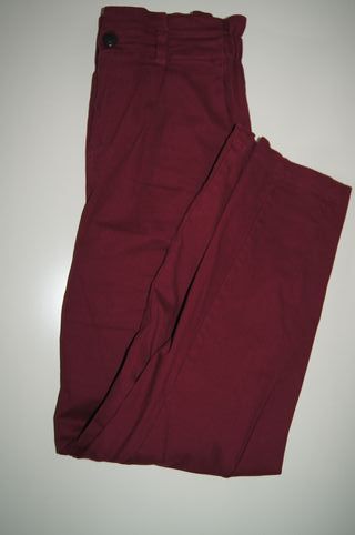 Calças de ganga em tom bordeaux, tamanho 38. - Cintura com passadeiras. - Fecho de botão e fecho éclair. - Bolsos frontais.