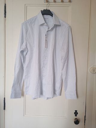 Camisa de riscas azuis e brancas da marca Calvin Klein, tamanho L (42-44/52-54). Esta camisa apresenta-se impecável. - Modelo de manga comprida. - Ideal para um visual elegante e sofisticado.