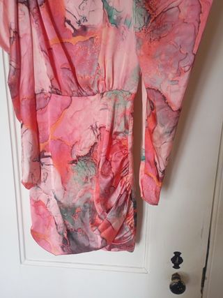 Vestido curto de cocktail da Dolores Promesas, em tons de rosa. Um vestido fluido e elegante, ideal para ocasiões especiais. - Padrão abstrato com tons de rosa e cinzento. - Modelo curto e justo. - Tecido leve e acetinado.