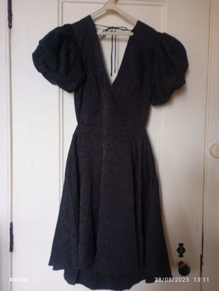Vestido de cocktail preto da marca Lucy Mecklenburgh, estilo midi. - Modelo elegante e sofisticado. - Possui mangas bufantes e decote em V. - Tecido com textura discreta.