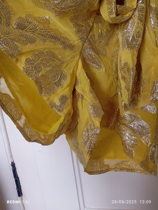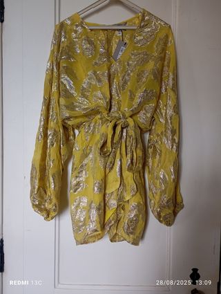 Vestido curto de cocktail da marca River Island. Um vestido deslumbrante, perfeito para uma ocasião especial. - Modelo curto com um laço na cintura. - Mangas compridas. - Estampa floral em tons de amarelo e dourado.