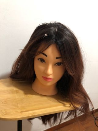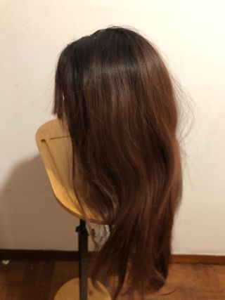 Linda peruca de cabelo longo com um tom castanho escuro. Perfeita para praticar penteados ou para uso. - Cabelo longo e ondulado. - Cor castanho escuro com reflexos. - A peruca tem um grampo preso no topo.