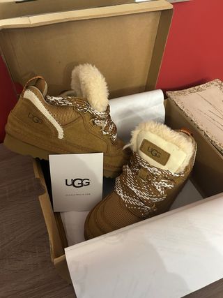 Botas UGG estilo sneaker em camurça e malha. - Detalhe de pelo na gola e forro. - Cadarços com padrão contrastante. - Sola robusta.