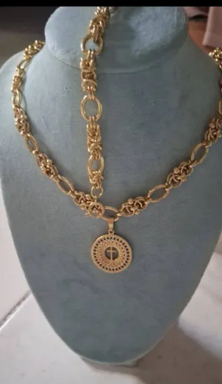 Conjunto de corrente e pingente em tom dourado. - Corrente com elos trabalhados. - Pingente redondo com detalhe vazado e cruz. - Fecho seguro.