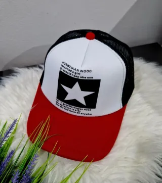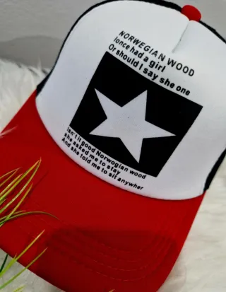 Boné estilo trucker com design inspirado na música Norwegian Wood dos Beatles. Apresenta uma estampa frontal com o título da música e uma estrela. - Painel frontal branco com estampa. - Aba e painéis traseiros em preto. - Detalhe de estrela branca em destaque.