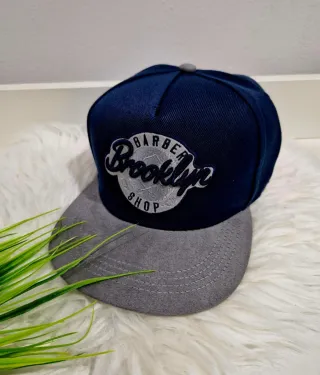 Boné masculino com design moderno. - Patch Barber Shop Brooklyn bordado. - Aba em cinza mescla. - Parte superior em azul marinho.