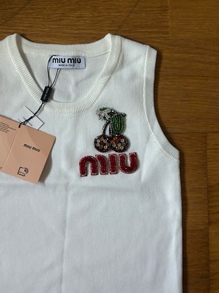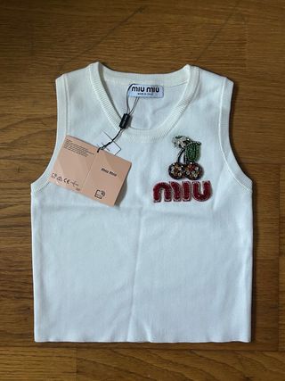 Top de malha branco da Miu Miu com um design encantador. - Detalhe de cerejas bordadas com cristais. - Logo Miu Miu em relevo com pedrarias. - Sem mangas.
