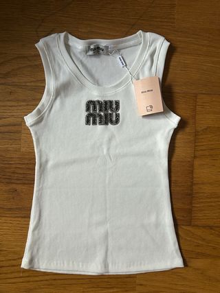 Top Miu Miu em malha canelada branca com um logo duplo de cristais pretos. - Logo Miu Miu em cristais pretos. - Malha canelada. - Sem mangas.