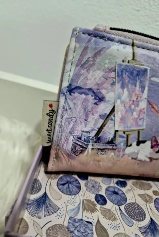 Bolsa com um design encantador e delicado, perfeita para organizar seus itens essenciais com estilo. - Estampa com uma bailarina e elementos inspirados em Paris. - Detalhes em tons de azul e roxo. - Alça de mão em couro sintético. - Pequeno pingente de peixe dourado no zíper.