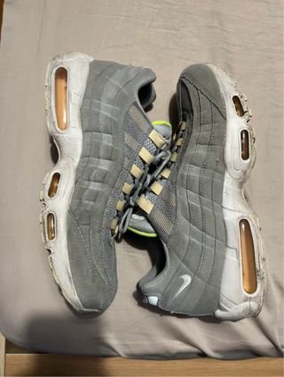 Tênis Nike Air Max 95 em cinza e branco. Design icônico com amortecimento visível. - Cabedal em camurça e mesh. - Detalhes em amarelo neon na língua. - Swoosh da Nike na lateral.