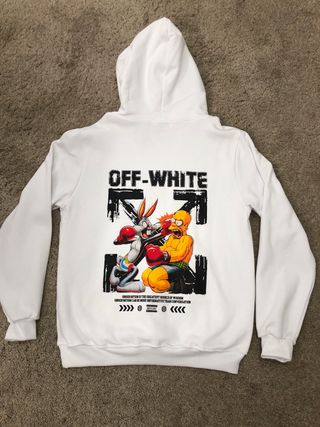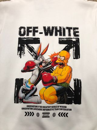 Moletom Off-White com estampa gráfica na parte de trás. - Estampa com personagens de desenho animado. - Logo OFF-WHITE na parte superior das costas. - Frases OBSERVATION IS THE GREATEST SOURCE OF WISDOM e OBSERVATION CAN BE MORE INFORMATIVE THAN CONVERSATION abaixo da estampa.