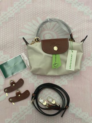 Mini bolsa Longchamp em bege com detalhes em castanho. - Alça de mão e alça de ombro removível. - Ferragens douradas. - Inclui chaveiro e etiqueta.