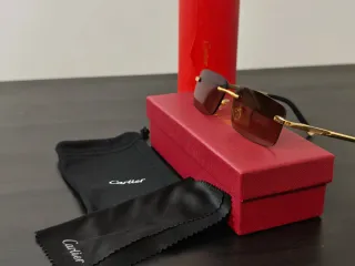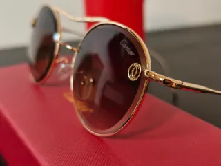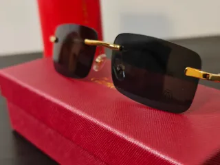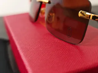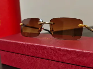 Óculos de sol elegantes com armação dourada e lentes castanhas. - Design sem aro. - Detalhes dourados na haste. - Inclui caixa e pano de limpeza Cartier.