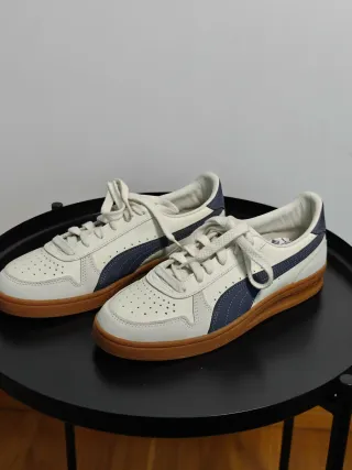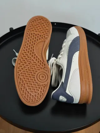 Sapatilhas Puma em pele branca com detalhes azuis e sola em borracha. - Design clássico e versátil. - Fecho com atacadores. - Detalhe da marca na lateral.
