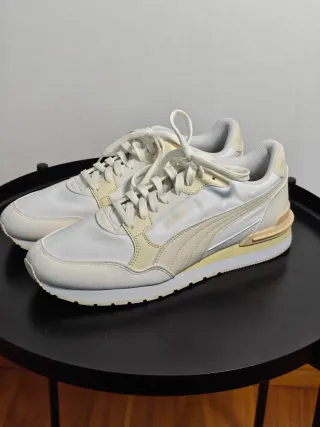 Sapatilhas Puma em tons de bege e branco, com um design moderno e casual. - Combinação de materiais. - Detalhes em camurça. - Sola em borracha.