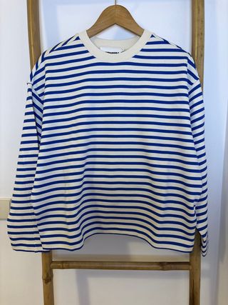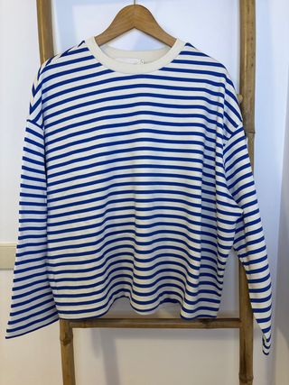 Sweatshirt com padrão de riscas azuis e bege. Nova, sem uso. Mulher - Gola redonda. - Mangas compridas. - Tecido confortável.