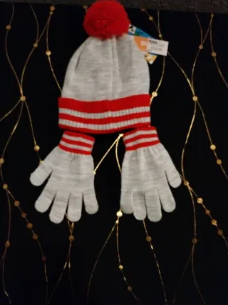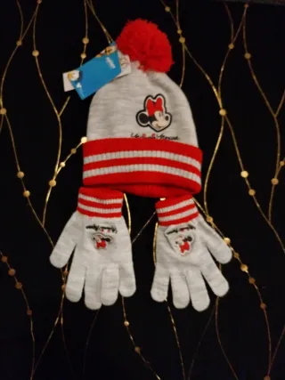 Conjunto de gorro e luvas com tema da Minnie Mouse. - Gorro cinza com detalhes em vermelho e pompom. - Luvas cinzas com estampa da Minnie. - Tamanho infantil. Tamanho: 52