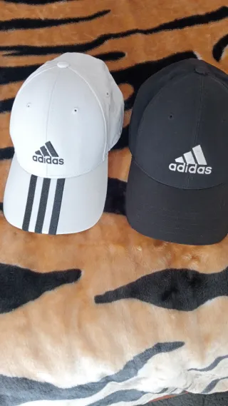 Conjunto de dois bonés da Adidas, um preto e um branco. - Design clássico com logo. - Três listras icônicas no boné branco.