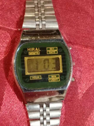 Relógio de pulso vintage da Hiral com um design clássico. A funcionar mas não dispensa manutenção pois já tem idade . - Caixa e bracelete em metal prateado. - Mostrador digital com fundo verde.