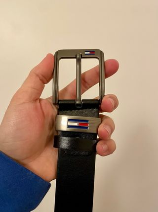 Cinto de couro com fivela metálica. - Comprimento de 120cm. - Detalhe da bandeira Tommy Hilfiger na fivela.
