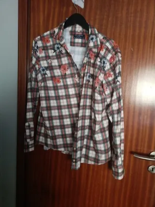 Camisa com padrão xadrez e estampa floral. - Manga comprida. - Fecho de botões à frente. - Gola clássica.