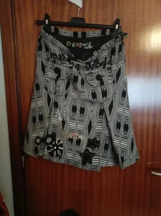 Saia com um padrão original da Desigual. - Padrão geométrico em preto e branco. - Detalhes de flores e estrelas aplicadas. - Laço na cintura.