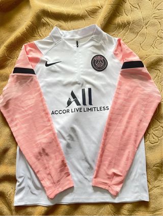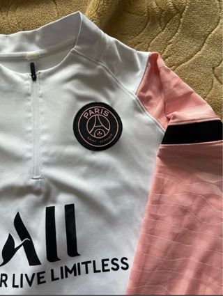 Camisa do Paris Saint-Germain com tema Visit Rwanda. - Mangas em tom rosa com textura. - Logo da Nike e escudo do PSG. - Detalhe de zíper no colarinho.