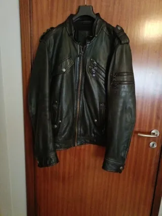 Casaco de couro com um design moderno e detalhes únicos. - Material: Couro - Fecho frontal com zíper - Bolsos com zíper - Detalhes nos ombros e punhos