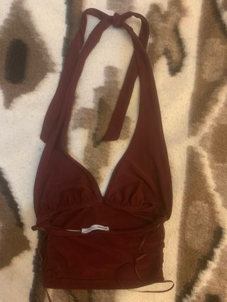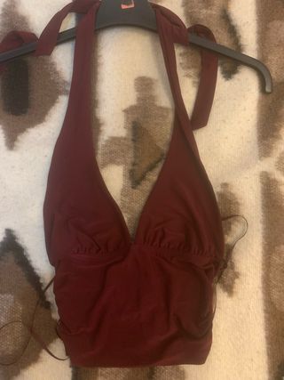 Top estilo halter com um elegante decote em V. - Cor bordô vibrante. - Design com amarração no pescoço. - Detalhes franzidos nas laterais.