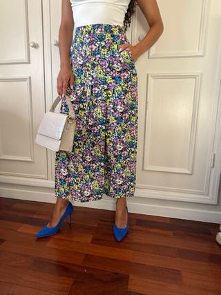 Calça culotte da Zara, com padrão floral multicolor. Faz efeito de saia. - Tamanho: S - Estampa floral vibrante - Perfeita para o verão