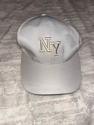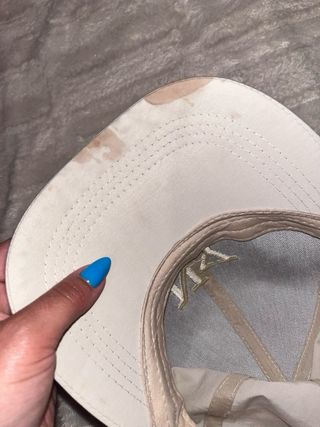 Chapéu creme com as letras NY. Tem umas manchas em baixo, que estão apresentadas na segunda imagem.