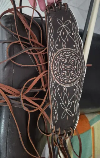 Cinturón de cuero con um design incustrado y tiras para ajuste. - Detalles bordados. - Acabamiento con franjas. Escucho ofertas.