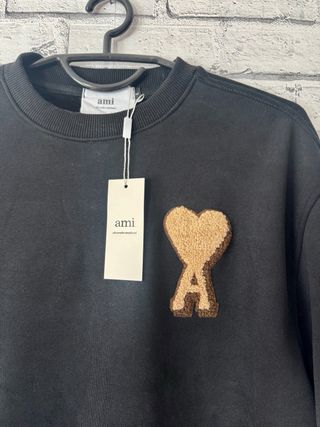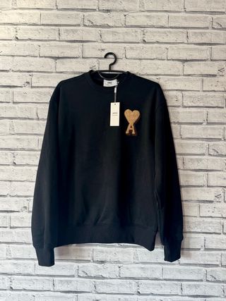 Camisola da Ami Paris em preto com um detalhe de coração castanho. - Gola redonda. - Manga comprida. - Aplicação de coração com textura.