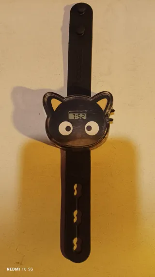 Relógio digital com um divertido design de gato. - Bracelete preta. - Detalhes em amarelo.