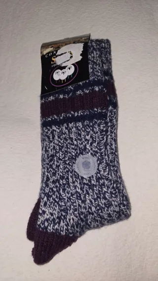 Par de meias de lã confortáveis e quentes, perfeitas para os dias mais frios. 42-46 - Design com riscas em azul e bordô. - Textura macia e agradável ao toque.
