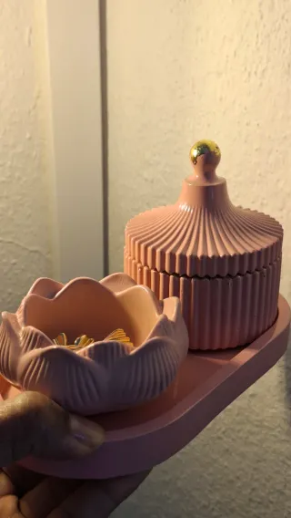 Conjunto de 3 peças para organizar joias com um toque de luxo. Inclui uma bandeja, um porta-joias com tampa e uma tigela em formato de flor. - Design elegante com acabamento canelado. - Detalhe dourado na tampa do porta-joias. - Tigela em formato de flor com pétalas delicadas.