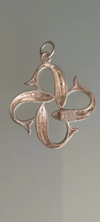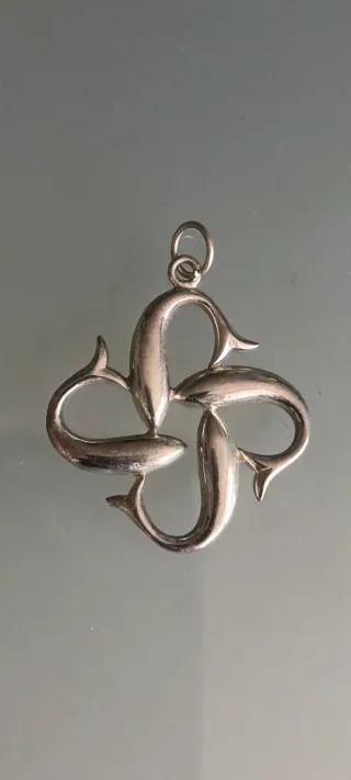 NOVO PREÇO-ÚLTIMA OPORTUNIDADE Pendente em prata com um design de quatro golfinhos entrelaçados. - Design único com golfinhos. - Material: Prata. - Mede 3,5cm. X 3,5cm.