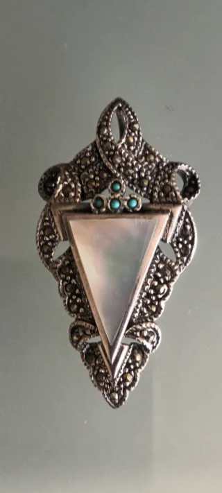 Fantástico pendente vintage de prata decorado com marcassitas e um triângulo de madrepérola ao centro. Realmente muito bonito! Mede 4,5cm. X 2,5cm.