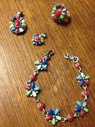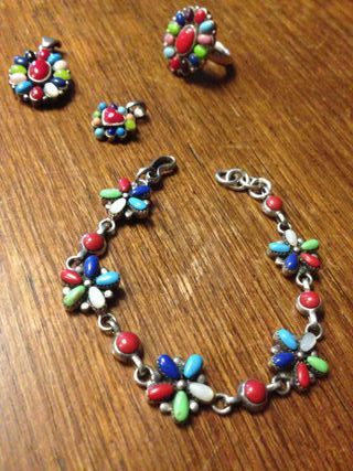 Fantástico conjunto Hippie em prata, original dos anos 60, composto por pulseira, anel e 2 pendentes. Visível marcas de fabricante, 925 e assinado "Lao". A pulseira mede 18cm. de comprimento. Anel mede 1,7cm. de diâmetro. Pendentes medem 3 e 2cm.de comprimento. Muito raro e em perfeitas condições. Imperdível!
