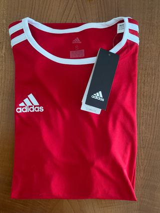 T-shirt desportiva Adidas em vermelho. - Gola redonda com detalhes brancos. - Logo Adidas em branco no peito. - Detalhes de riscas brancas nas mangas.