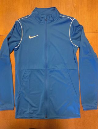 Casaco desportivo Nike em azul. - Gola alta com fecho. - Detalhe de risca branca nas mangas. - Logótipo Nike bordado no peito.