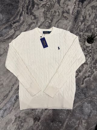 Malha de gola redonda da Polo Ralph Lauren com um padrão de trança clássico. - Padrão de trança. - Gola redonda. - Logo do cavaleiro bordado no peito.
