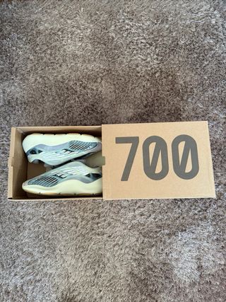 Tênis Adidas Yeezy 700 V3 em tons de bege e cinza. - Design moderno e futurista. - Detalhes em cinza e bege. - Cadarços cinza.