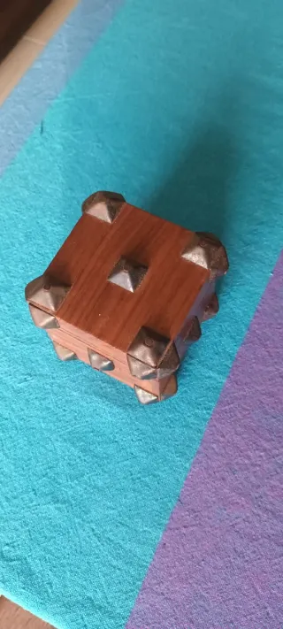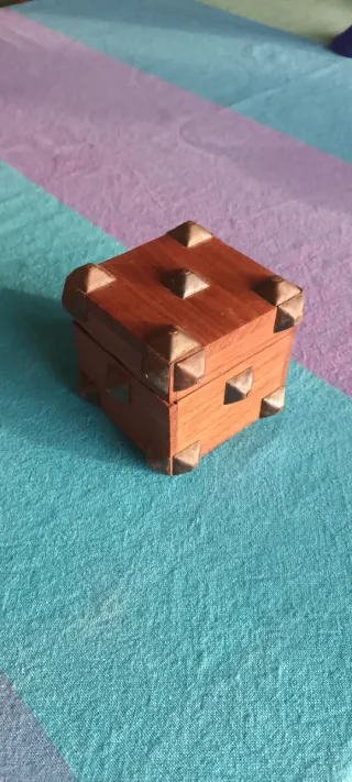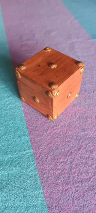 Pequena caixa de madeira, ideal para usar como porta jóias ou outros pequenos objectos pessoais. Mede 7,5cm. de largura, comprimento e altura.