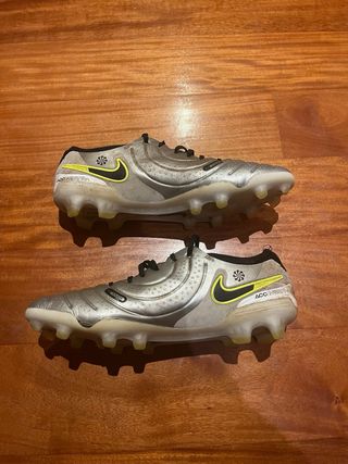 Botas de futebol Nike Tiempo Legend em prata com detalhes em amarelo. - Design moderno e arrojado. - Sola com travas para melhor aderência em campo.