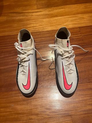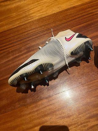 Botas de futebol Nike Phantom com um design moderno. - Cor principal branca com detalhes em rosa. - Sola adequada para campos de futebol.